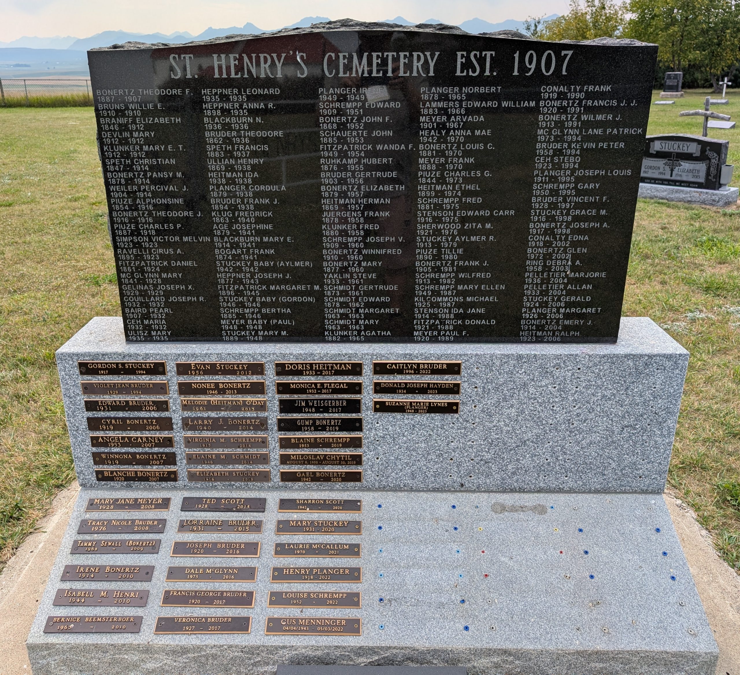 St. Henry’s Cemetery stands as more than simply a burial ground: it is a living link to the waves of settlement and faith-based community building in southwest Alberta in the early 20th century. The cemetery, perched on its ridge with a panoramic view of the Rockies, Porcupine Hills and prairie to the east, embodies the pioneer spirit and the deep meaning the land holds for these families.