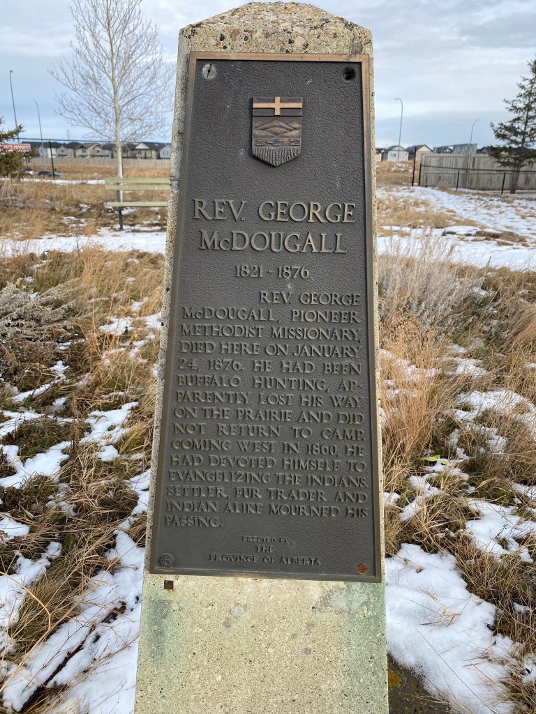 The location of Rev. McDougall’s place of death is marked by a plaque and a concrete obelisk market in north Calgary, just south and west of Stoney Trail and 14th Street, N.W. The plaque is a stainless-steel plate with narrative by welding marks. There is a pathway from a street to the markers on a small rise containing original prairie grass.